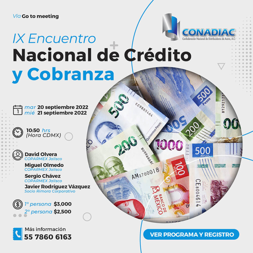 El Comité de Crédito de la Confederación Nacional de Distribuidores de Acero, les hace una atenta invitación a participar en el IX Encuentro Nacional de Ejecutivos de Crédito y Cobranza Virtual 2022, el cual se celebrará los días 20 y 21 de septiembre vía web.